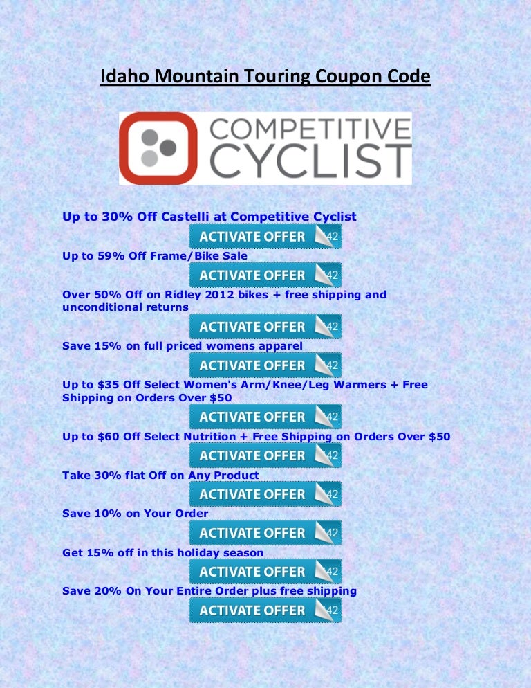 Competitive cyclist coupon code by rozencutts - Issuu Idaho Mountain Touring Coupon Code. Up to 30% Off Castelli at Competitive Cyclist Up to 59% Off Frame/Bike Sale Over 50% Off on Ridley 2012 bikes + free shipping and unconditional returns Save 15% ...